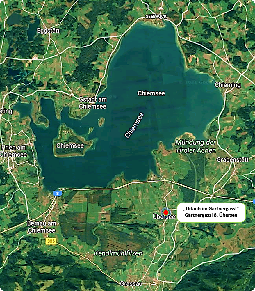 Autobahn A8 – Ausfahrt Übersee am Chiemsee, von hier ca. 6 Minuten zur Ferienwohnung.